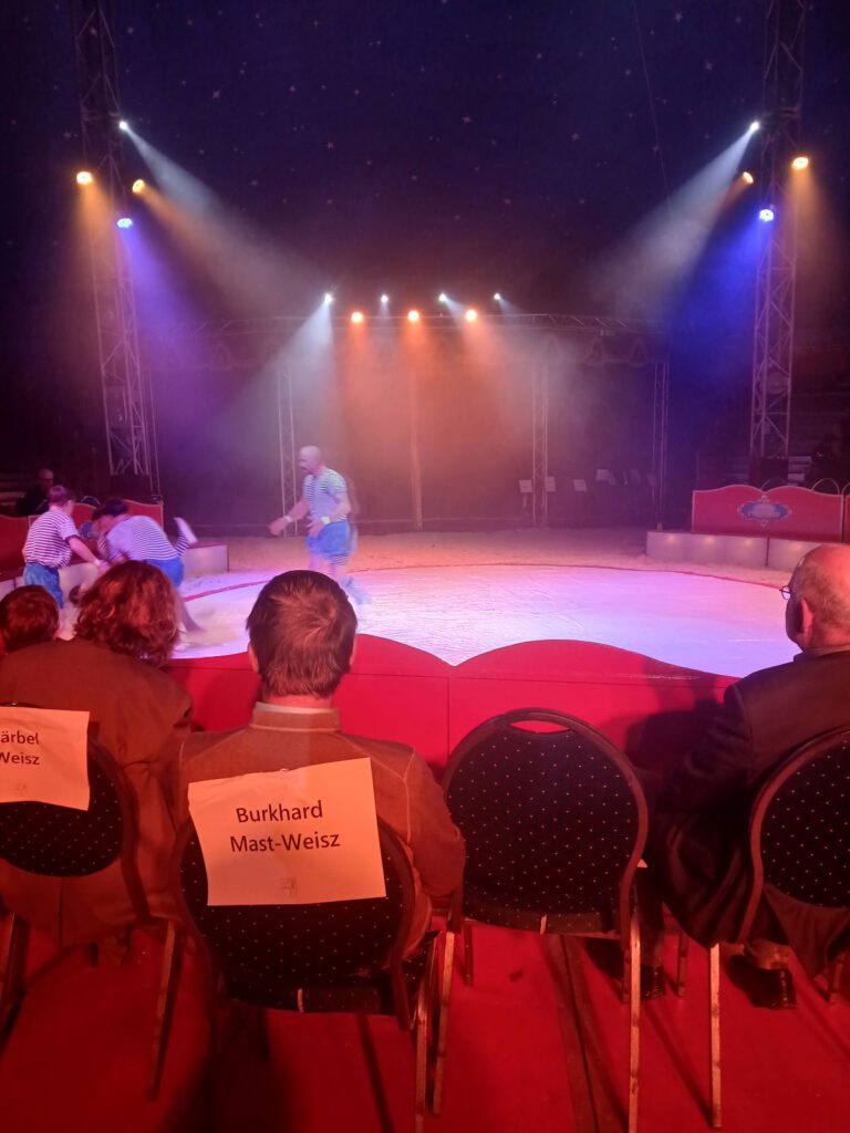 Mit einer kurzweiligen und außergewöhnlichen Veranstaltung verabschiedete sich Burkhard Mast-Weisz von seinem Amt als Remscheider Oberbürgermeister. Dazu hatte die Stadt viele Weggefährtinnen und Weggefährten aus Politik, Stadtverwaltung, Vereinen und Institutionen, Kirchen und Religionsgemeinschaften, Schulen sowie der Stadtgesellschaft in den Zirkus Casselly eingeladen, der in den Herbstferien auf dem Remscheider Schützenplatz ein fulminantes Ferienprogramm für viele Kinder und Jugendliche bot. Dieses Projekt hatte der scheidende OB einst als Sozialdezernent nach Remscheid geholt und bis heute mit großer Begeisterung begleitet. Dementsprechend herzlich und engagiert gestaltete die Familie Casselly mit eindrucksvollen, spannenden und humorvollen Darbietungen das von Horst Kläuser moderierte Abschiedsprogramm, das Mast-Weisz gemeinsam mit seiner Familie auf den Ehrenplätzen verfolgte. Und selbstverständlich musste der künftige Ruheständler auch selbst in die Manege, wo er mit den Artisten einen viel beklatschten Auftritt hinlegte.