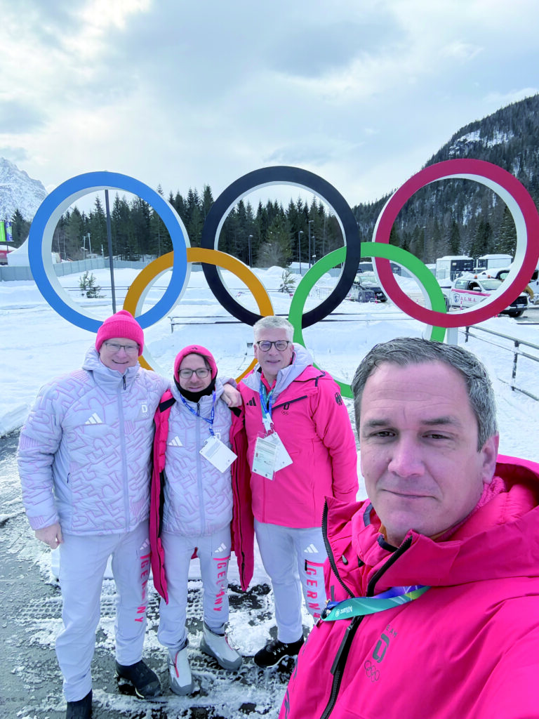 Jens Nettekoven, einer von fünf Vizepräsidenten des Deutschen Olympischen Sportbundes, mit Funktionärskollegen bei den Winterspielen in Italien. Die Kleidung der Herrschaften entspricht den Ausstattungs-Standards der ganzen deutschen Delegation. Foto: Nettekoven