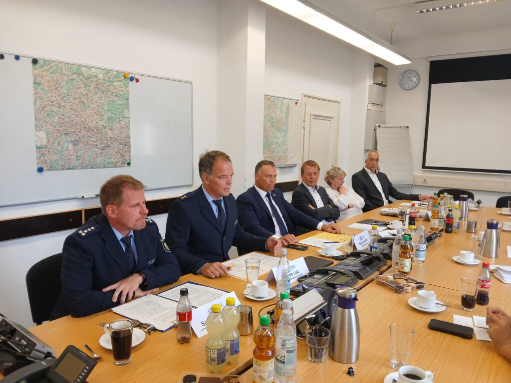 Informierten über den Stand der Ermittlungen gegen den Unfallfahrer und über eine Vielzahl von Maßnahmen für mehr Verkehrssicherheit: Sascha Gerhardt, Leiter Führungsstelle der Polizei in Remscheid, Falko Lotz, Leiter Direktion Verkehr, Polizeipräsident Markus Röhrl, Oberbürgermeister Burkhard Mast-Weisz, Rechtsdezernentin Barbara Reul-Nocke und Arndt Liesenfeld, Leiter des Kommunalen Ordnungsdienstes (v.l.)